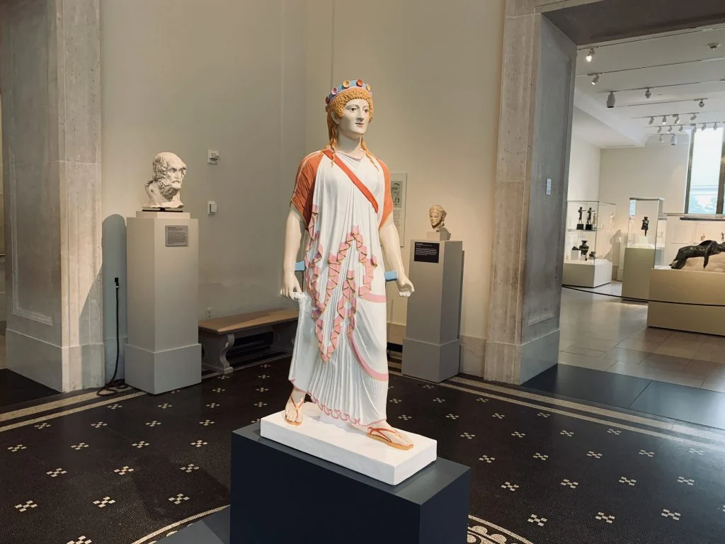 Savantii s-au batut inainte si inapoi, in special in ultimul deceniu, dar majoritatea stiu acum cu siguranta ca marile marmura ale Greciei au fost, in mare, pictate stralucit in perioada lor de glorie. Cel de-al treilea regizor al Met, Edward Robinson, si curatorul Gisela MA Richter, au sustinut ideile secolului trecut in aceasta problema. Robinson „a incurajat achizitionarea de sculpturi care inca purtau urme de vopsea”, scrie Met, iar Richter a publicat impreuna o lucrare din 1944 despre eforturile de a determina culorile originale ale unor astfel de sculpturi, inclusiv pietrele funerare atice si un Sfinx acum iconic. Marele lor progres a dovedit ca grecii au pictat carnea si pe figurile lor.